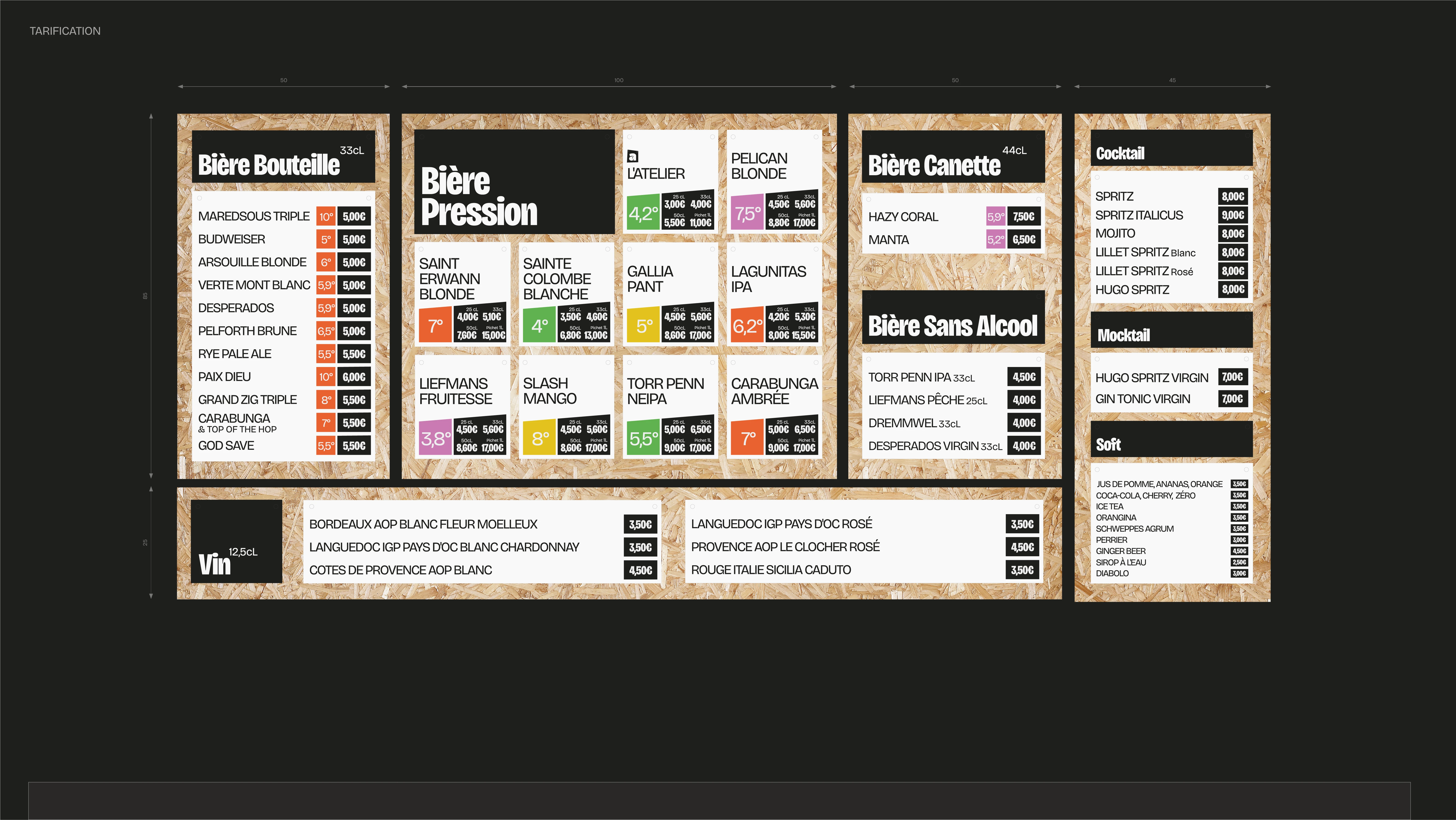 Nous avons fait le choix d’assumer et de valoriser l’imparfait. Celui d’une reconversion, d’un lieu façonné en grande partie par ses fondateurs, où chaque détail raconte une histoire. Cette direction a donné naissance à un univers graphique singulier, fait de formes décalées, de tracés dessinés à la main, de textures brutes et de références à l’univers de l’atelier : bois percés, planches, matière vivante.